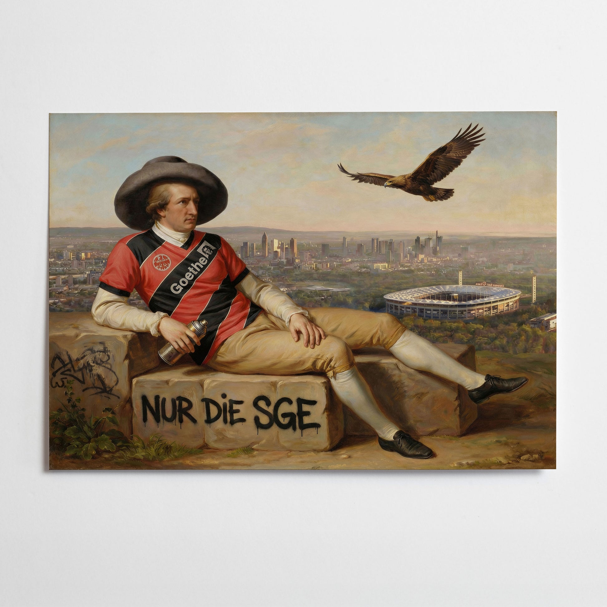 Würde Goethe heute leben, wäre er auch ein Adler. Nur eine Stadt, nur ein Verein! Dieses Frankfurt Wandbild verbindet klassische Kunst mit moderner Popkultur. Das Motiv zeigt den Dichter im Trikot mit Blick über die Skyline von Frankfurt und das Waldstadion. Ein ungewöhnliches Kunstmotiv für alle Frankfurt-Fans und Liebhaber kreativer Frankfurt-Kunst.